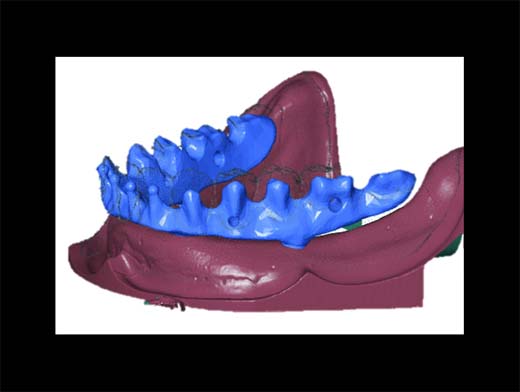 Likewise, the screw threads were printed into the earlier implanted jaw, which was itself also created as a single piece of 3D printed titanium. Whilst the jaw was made before the bridge, both were made from the same medical data. The virtual versions of both were shown to mesh long before either were printed out, and by use of a physics simulation in virtual reality, it was possible to tell for absolute certain if it was possible to screw the screws in without hitting obstructions. Again the medical data was invaluable, as the entire mouth area can be simulated with the prosthetics in place, along with the screwdriver itself. The surgeon can make absolutely sure they have enough room to proceed, by operating on the virtual patient before they operate on the actual patient. The connector is implanted by making an incision in the floor of the mouth, and slotted down into the jaw. Once it is in place, it sits flush with the floor of the mouth, all six screws tightened into the jaw, without compromising the jaw's integrity. All that pokes up are tiny cradles, designed to affix to the dentures, and hold them in place. This model does not have any capability to funnel nerve endings to the individual teeth, so the patient loses the sense of pressure when biting down on something, at least with their lower teeth, but that is no different than with any normal dental bridge. The basic design of this system does not preclude such things, it is more a case that such fine nerve routing is presently beyond us, rather than a limitation of the technological concept. The whole system is designed such that any individual piece can be removed with minimal disruption to the other implants, should damage occur, or a more advanced replacement be developed. So long as the original medical data and CAD data is preserved, replacement implants of any type can be manufactured in hours, to the same exacting standards, and implanted with a guarantee they will interconnect on that patient, and that patient only. Further ReadingLarge Image Display: Making a Bespoke JawLarge Image Display: Prosthetic Jaw Hinging Large Image Display: Teeth Designed for Prosthetic Jaws ReferencesForm Fitting Prosthetics Using DICOM Data