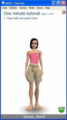 Once that is accomplished however, IMVU loads up swiftly, and presents you with something a lot like 'construct' from the Matrix films. In this white space, you can see your current IMVU avatar, and the clothes you have decided to wear. Here, you can change outfits, or avatars, eye colour, hair colour, make-up and accessories before venturing into chat. |