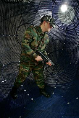 Many attempts have been made, but to date, the successes have been minimal. C1s and C3s provide visual immersion, C6s (Caves) provide spatial immersion, but treadmills and sliding tiles restrict movement direction or speed. The sphere works by rotating against the six wheels at its base. Each is pressure and movement sensitive, picking up the slightest movement from inside and correctly interpreting the direction and force. The signals are transmitted immediately to the virtual environment, relayed back to the user via a HMD unit that covers their eyes. As the user is moving physically the same way as their actions are reported virtually, there is no conflict with the inner ear, and simulator sickness is drastically reduced. |