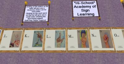 Inside the Academy is a single large room. On the walls all the way round this room is the complete ASL alphabet, with each letter printed large and clearly, with a corresponding picture next to it. Clicking with whatever pointing device you are using to access the VR world (mouse, 3D pointer, glove, etc) will open a new window in which a dictionary page gives you further explanation, and the option of a Quicktime movie of a hand creating all the movements for the letter.