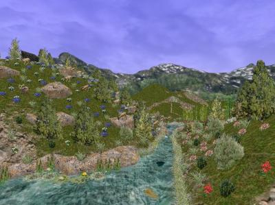 This effect is all throughout Leaves. Built mostly of low-polygon count flat objects, it manages to cram thousands upon thousands of them into a given scene, each representing an entire flower, bush or tree. Three dimensional rocks lay about, building up into hills and mountains, and the whole area is criss-crossed with lakes, streams, rivers and hundreds of different waterfalls. |