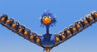 Whilst each bird was modelled to a high degree of detail, and a full facial structure created, it is worth noting that only two bird models were used. As shown here, all the little birds are the same model, just with - mostly - different expressions. In fact, if you look closely at the second and third from the left, as well as the last two on the right, you see birds which not only look alike, but have identical expressions. |
