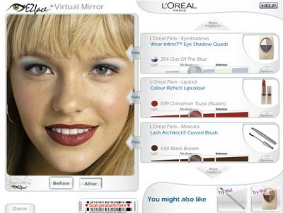 The kiosks are small units, small enough to be attached to standard cosmetic display shelves, with a camera at face height, below which hangs a flatscreen monitor, and below which sit a barcode reader and concealed photographic printer. Basically, there is no cubicle to curtain off, so you are out in the open in an isle of the store you are in, so perhaps keep the more extreme mixes to yourself, or not. |