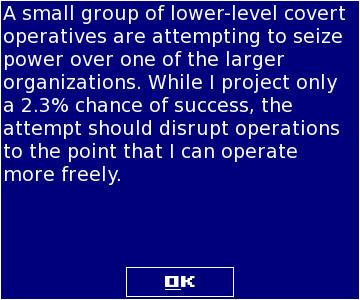 Whilst each action you undertake has a chance of increasing the threat level for each of these modifiers, you can also decrease them by learning new technologies to confuse and deceive.