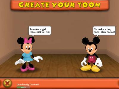 Creating a character is easy. First, you choose a gender for your character, by clicking on either Mickey, or Minnie Mouse. That character then asks you if you are sure, and walks off screen if you are.