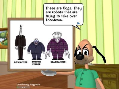 Once your character is created, you are places in a large shop, in a non-persistent, non-collaborative subworld. This tutorial world exists solely to show you the basics of ToonTown, with liberal dialogue from the three denizens of this world, and a linear progression path to educate you with how to play.